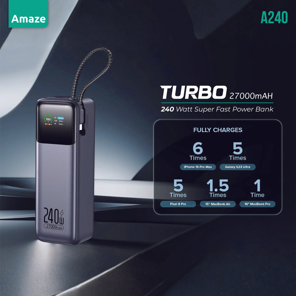 The Amaze A240 Power Bank is a premium portable charging solution built for laptops, smartphones, tablets, and gaming devices. With its massive 27,000mAh (97.2Wh) capacity and powerful 240W total output, it delivers ultra-fast charging for MacBooks, iPads, iPhones, Android devices, and more — all at the same time.
