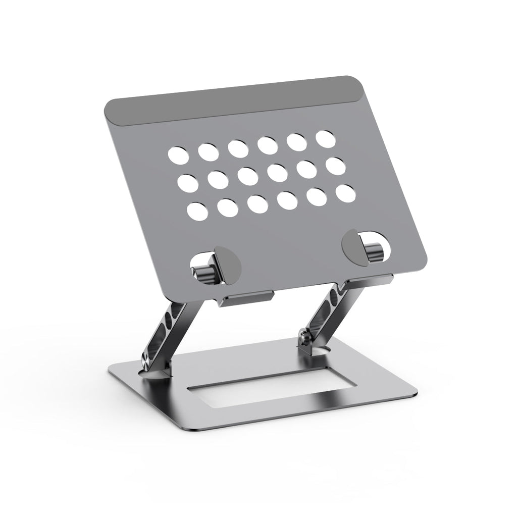 This product features an aluminum and galvanized material, allowing for easy height adjustment and suitability for laptops and tablets ranging from 10-17 inches in size. The sleek grey color adds a touch of modernity to any workspace.