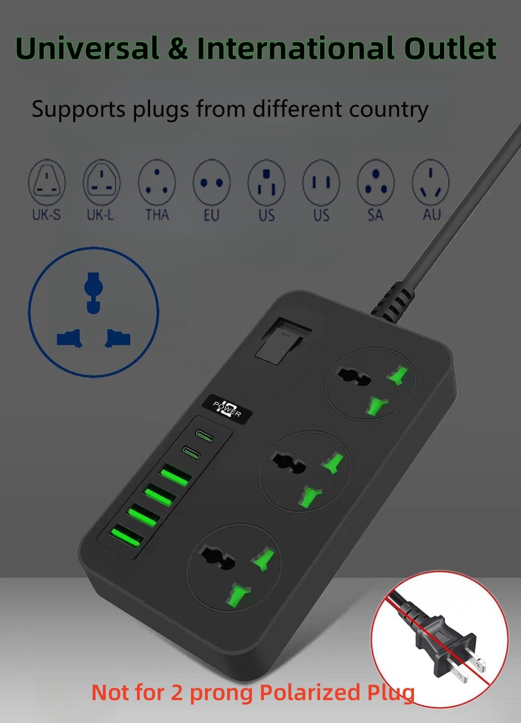 - 📣【Universal AC Outlets for Travelers】:Designed with 2.1 inches spacing, the universal AC outlets accommodate large plugs. With a voltage range of 110-240V, this outlet extender caters to different plug standards, such as British, European, Australian, and more. An ideal choice for international travelers, featuring universal outlets compatible with different international plugs. (NOTE: Not Support polarized 2 prong plugs)